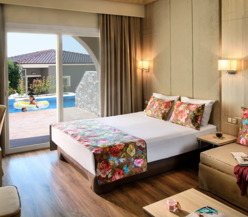 Modern, geräumig und elegant, dieses schöne Zimmer ist eine ideale Wahl für einen wirklich erholsamen Urlaub. Das komplett renovierte Zimmer bietet alles, was ein moderner Reisender sucht, einschließlich einer voll möblierten Terrasse mit Gartenblick.