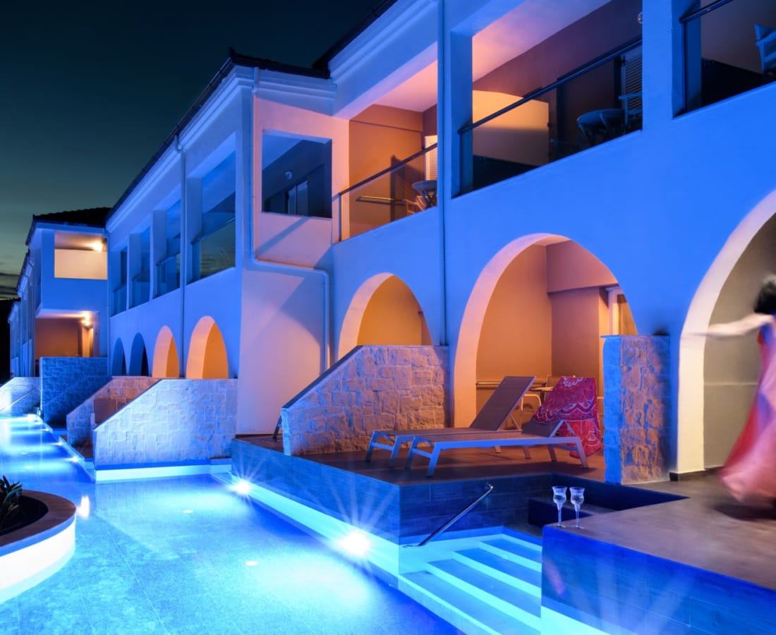 Das luxuriöse Doppelzimmer wurde mit Blick auf Komfort entworfen, um einen wirklich erholsamen Aufenthalt zu gewährleisten. Das Zimmer verfügt über ein Doppelbett sowie zusätzliche Sofas - Betten für mehr Gäste sowie eine große Terrasse mit Sonnenliegen und direktem Zugang zum Gemeinschaftspool.